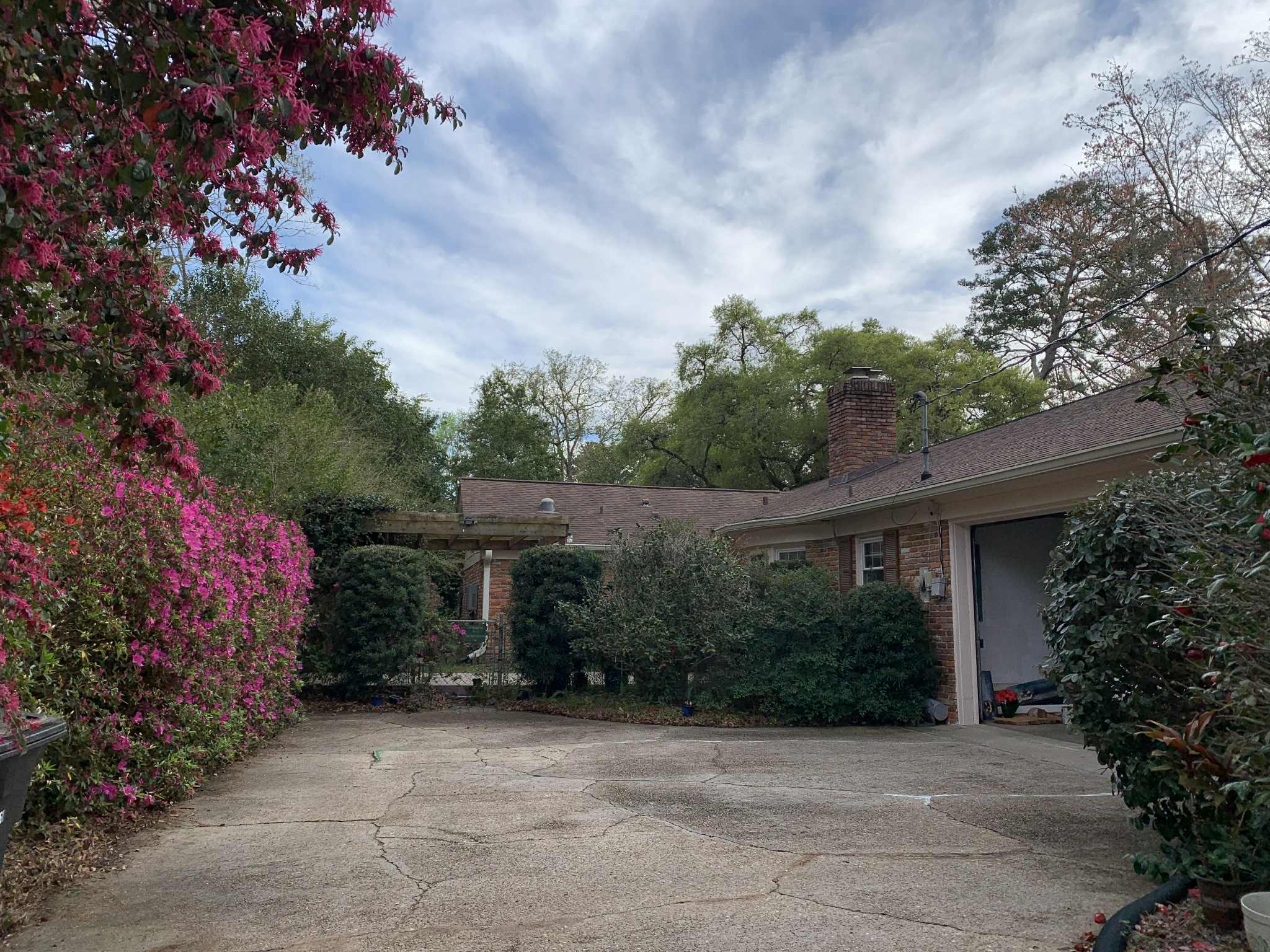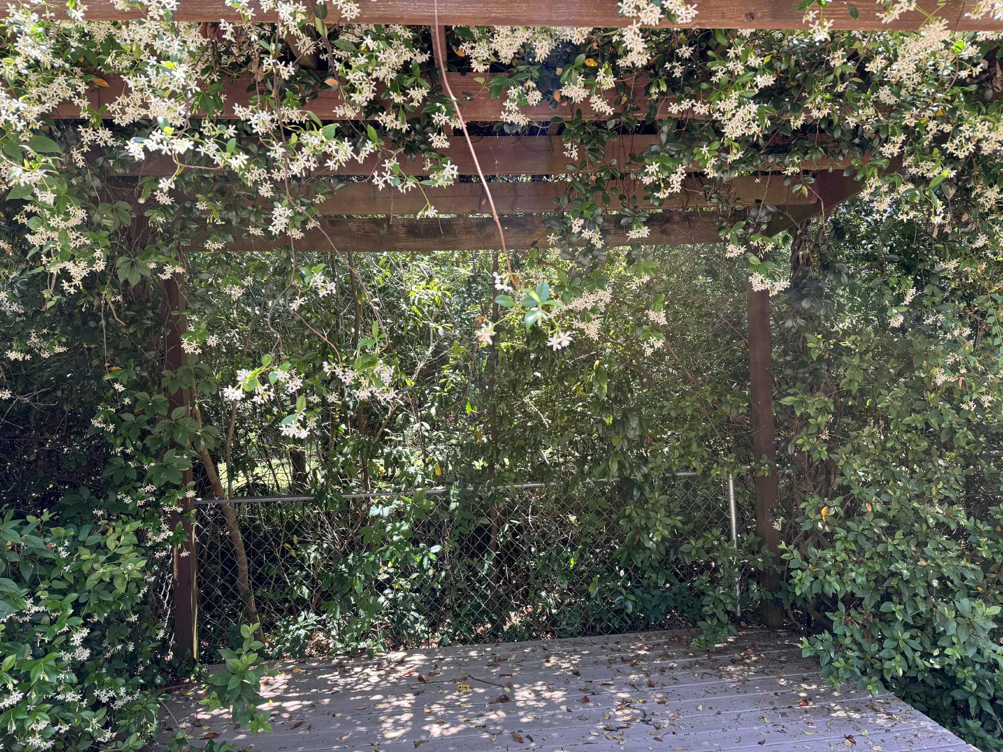 The house has a spacious garage, unusual for this historic neighborhood and very useful. The driveway is off Maple Dr., and the garage door is not facing the street, giving you privacy when keeping it open. See photo of the end of the driveway (on the left). At the end of the driveway there is a gate to the back wooden patio and pergola. The wood there is damaged but the seller decided to leave them for now to let the new owner(s) decide whether they want to repair or remove them. There is mature jasmine at the back of the pergola that has currently been trimmed away from the front (as seen on the photo on the left), the picture on the right (view from kitchen's patio entry) shows how pergola looks with jasmine over it.