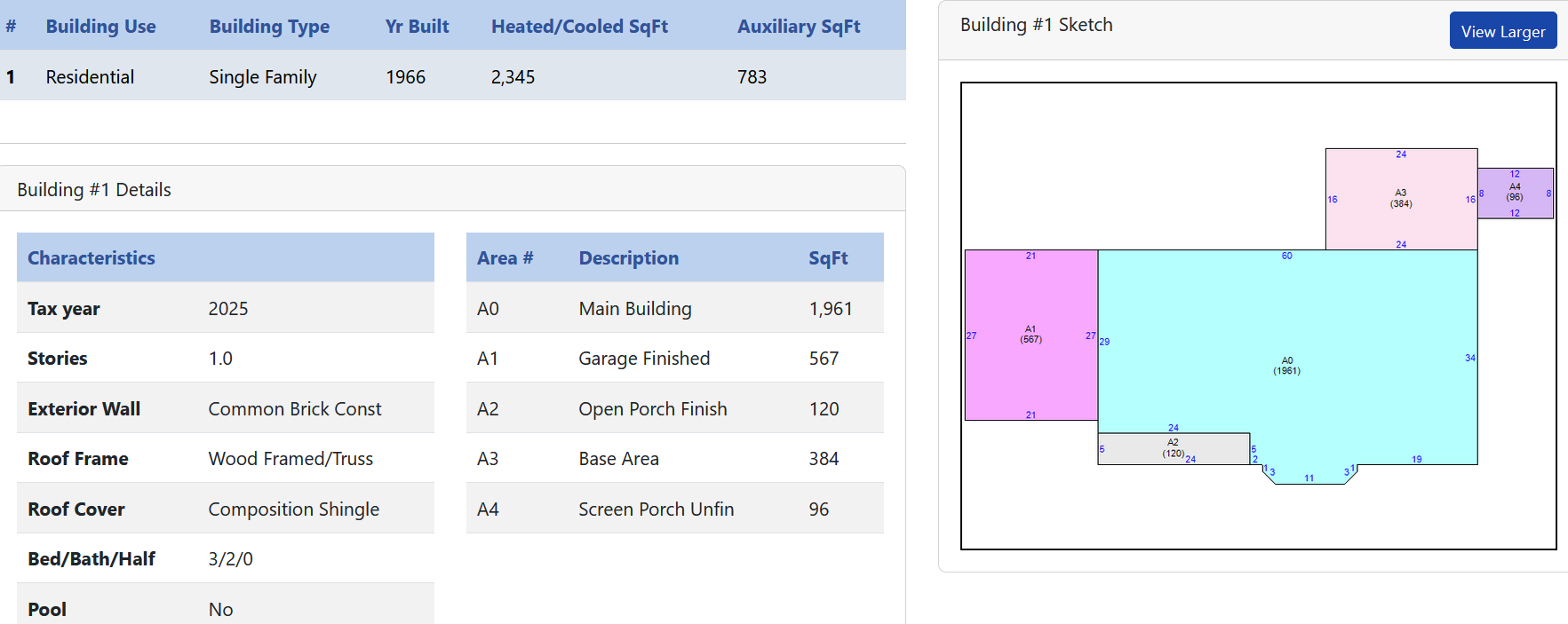 The house was built in 1966 on a conrete slab, with wooden frame and brick veneer. The picture below is from leonpa.org website and it includes the addition to the house (A3) that expanded one of the bedrooms into a new "primary", expanded J&J bathroom, and added a walk-in closet. The scheme also shows the front porch (A2) and the screened porch off the new "primary bedroom." That screened porch (A4) should be a little lower on the scheme.