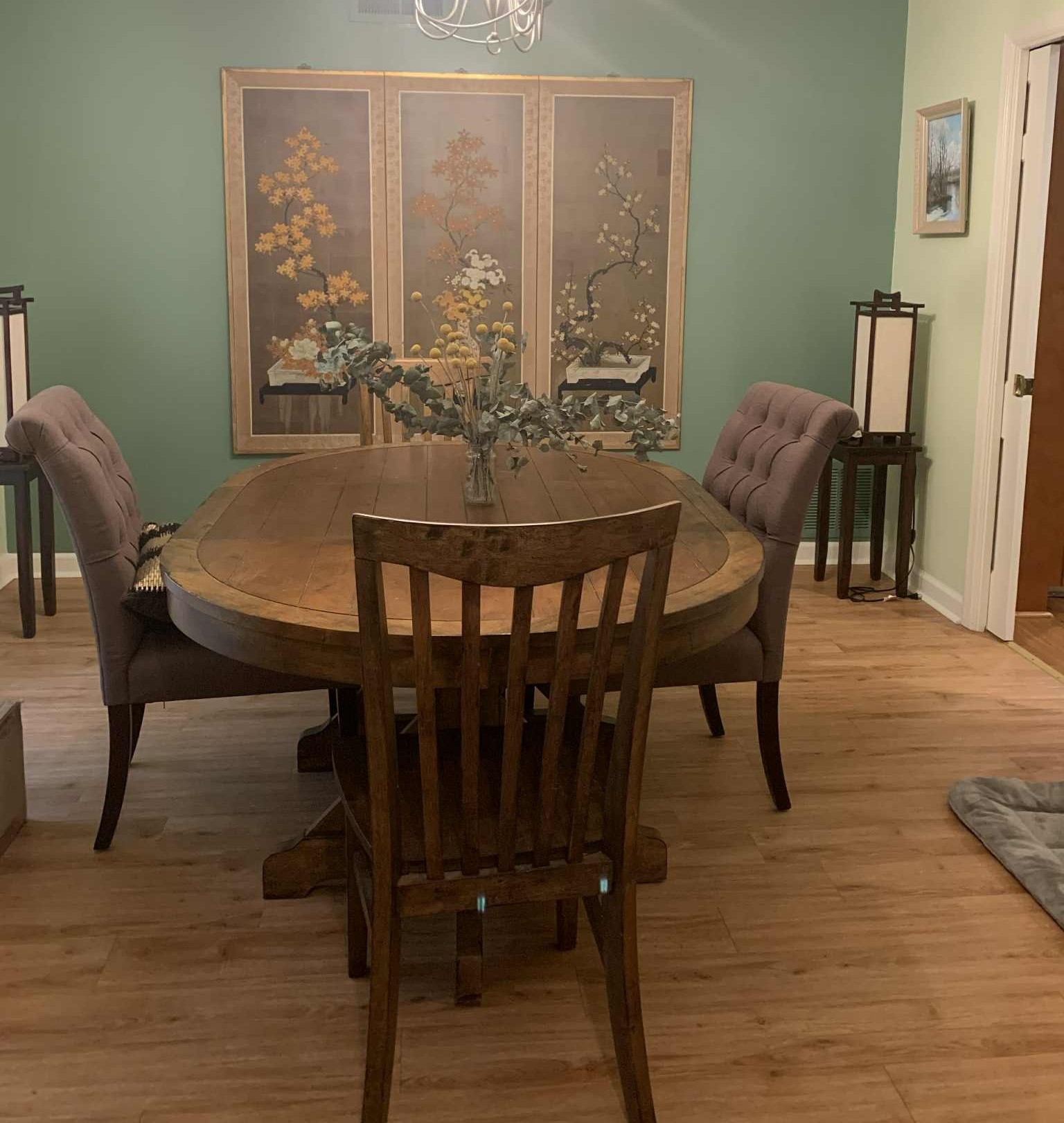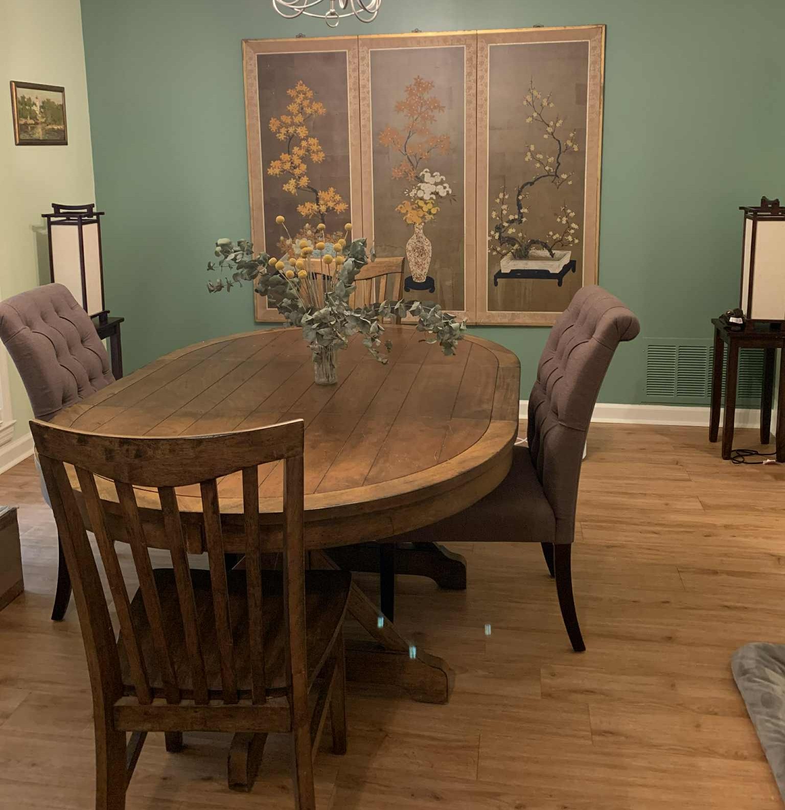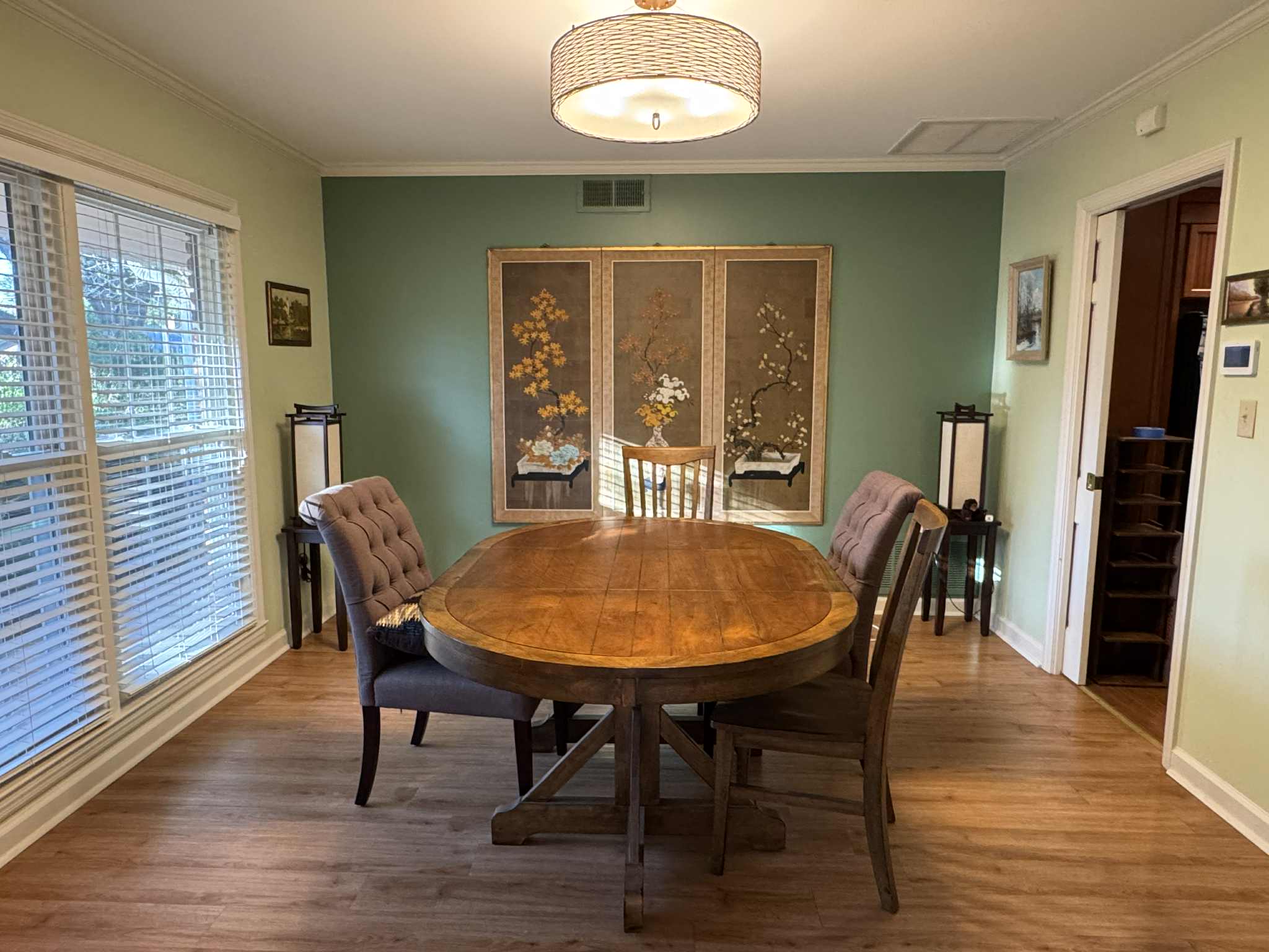 Advantages of having separate kitchen, living room, and dining room include that you can decorate them in different themes and give yourself a different experience when socializing in them. Designer Varaluz (Flow collection) 5-light pendant included in sale. Hammered ore and silk shade, list price over $1k.
